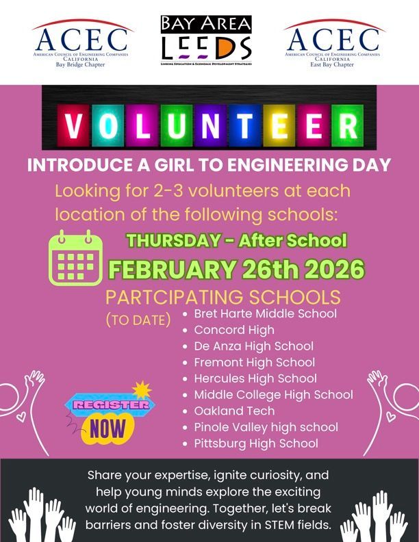 ACEC East Bay and ACEC Bay Bridge Chapter along with Bay Area LEEDS present Introduce a Girl to Engineering Day 2026 on Thursday, February 26th. This event wouldn’t be possible without dedicated professionals willing to share their time, experience, and enthusiasm for engineering. Volunteers play a vital role in inspiring and encouraging the next generation of girls to explore STEM careers. If you’re interested in making a meaningful impact, please sign up today.